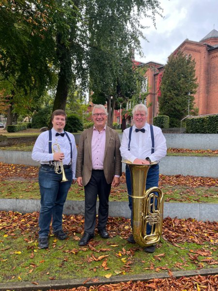 Zum Erfolg trug auch die Mitwirkung von Frau Behnke (Posaune), Herrn Treudler (Trompete) und Tim Edler (Trompete) bei. Letztere hatten kurz vorher einen mehrtägigen Workshop beim legendären Orchesterleiter und Tenorhornisten Ernst Hutter absolviert (siehe Foto von Tim Edler (v.l.), Ernst Hutter und Uwe Treudler).