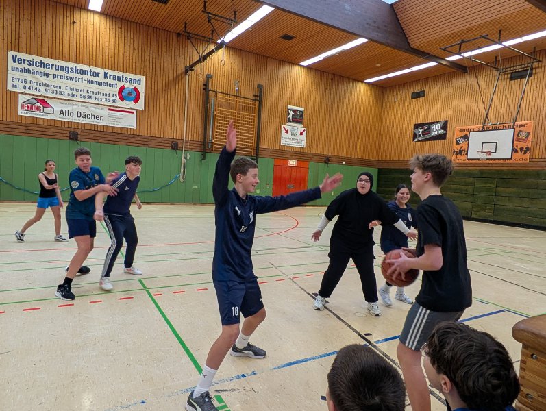 Traditionell fand am Ende des Halbjahres wieder das Basketball-Turnier im 8. Jahrgang statt. Am 29.01.2026 ging es vier Stunden lang auf den Spielfeldern und im Freiwurfwettkampf um Körbe und Punkte. Nach den wochenlangen Vorbereitungen im Sportunterricht zeigten die Klassen gute und (meist) faire Spiele und die Pausen wurden mit Gesprächen, Musik und Snacks ebenfalls sinnvoll genutzt. Zudem konnten die Klassenleitungen ihre Schützlinge mal wieder ohne Unterrichtszwänge beobachten, anfeuern und… manchmal auch an die Regeln erinnern.
