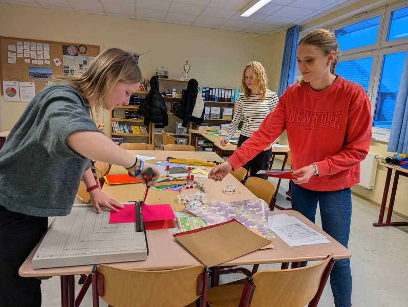 Das Lesefest wurde von den Deutschfachkolleg*innen unter der Leitung von Fachbereichsleiterin Anne Pape liebevoll vorbereitet und durchgeführt. Unterstützung erhielten die Lehrkräfte durch die tatkräftigen Schüler*innen des 11. Jahrgangs, die bei Auf- und Abbau sowie bei der Betreuung der Stationen eine große Hilfe waren. So konnten sie beim Basteln der Lesezeichen zur Seite stehen wie auch den Lesespaziergang begleiten.