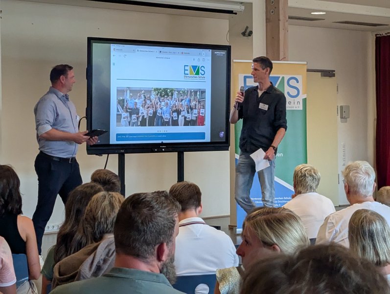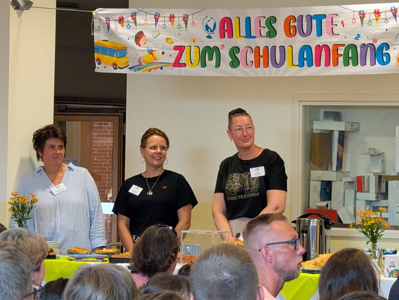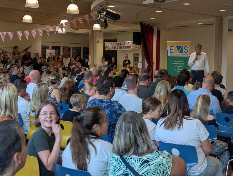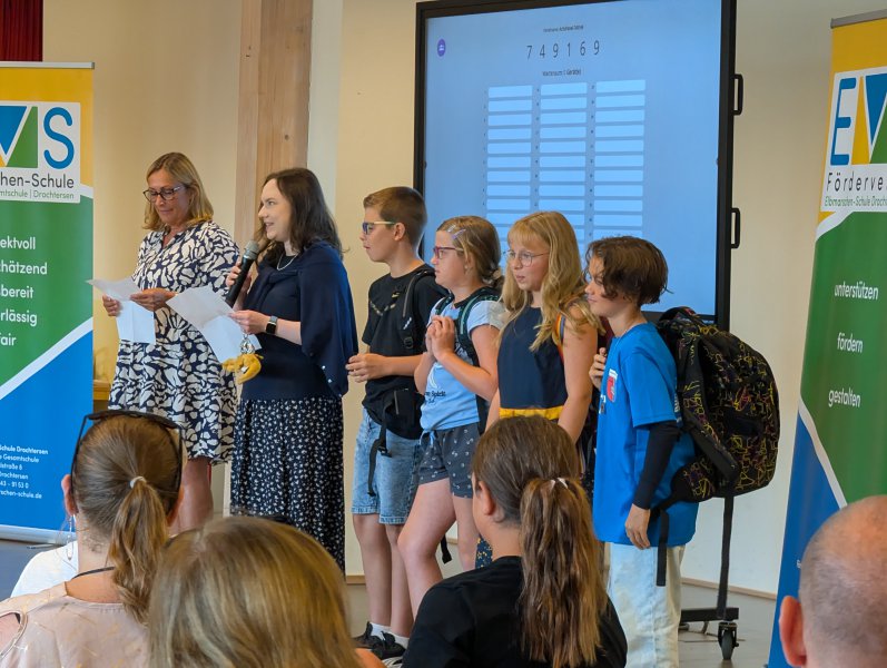 Die Eltern und Verwandten durften ihrerseits in der Mensa warten und wurden mit Getränken und Kuchen durch den Schulelternrat verwöhnt. Gymnasialzweigleiter Thomas Leibing und Hauptschulzweigleiter Volker Gramkow informierten sie zudem über alles Wissenswerte an unserer Schule, bis es im Anschluss auf dem Pausenhof ein großes Wiedersehen gab und die neuen Schüler*innen ihre Willkommensgeschenke präsentieren konnten.