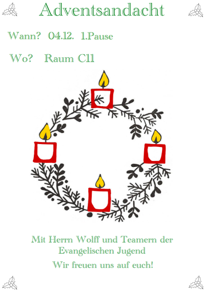 Auch in dieser Weihnachtszeit finden an der Elbmarschen-Schule wieder die Adventsandachten statt. Alle sind eingeladen, am 4.12. in der ersten großen Pause im Raum C11 gemeinsam zu singen und die Adventszeit zu feiern.