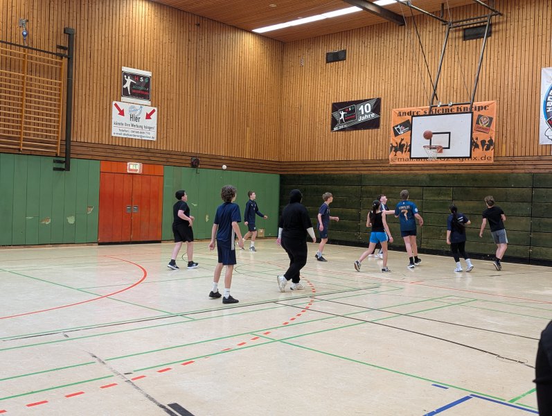 Traditionell fand am Ende des Halbjahres wieder das Basketball-Turnier im 8. Jahrgang statt. Am 29.01.2026 ging es vier Stunden lang auf den Spielfeldern und im Freiwurfwettkampf um Körbe und Punkte. Nach den wochenlangen Vorbereitungen im Sportunterricht zeigten die Klassen gute und (meist) faire Spiele und die Pausen wurden mit Gesprächen, Musik und Snacks ebenfalls sinnvoll genutzt. Zudem konnten die Klassenleitungen ihre Schützlinge mal wieder ohne Unterrichtszwänge beobachten, anfeuern und… manchmal auch an die Regeln erinnern.