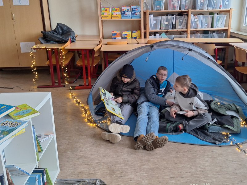Wer kein eigenes Buch dabei hatte, konnte aus dem neuen, riesigen Fundus an Büchern auswählen. Eine großartige Weihnachtsaktion von Airbus ermöglichte es uns, zahlreiche Lese- und Abenteuergeschichten für die Schüler*innen anzuschaffen. Darüber hinaus wurden uns auch kleine Zelte und Lampen sowie weitere Utensilien durch diese Aktion zur Verfügung gestellt. Dafür sind wir sehr dankbar, denn so entwickelte sich unser Lesefest zu etwas ganz Besonderem.