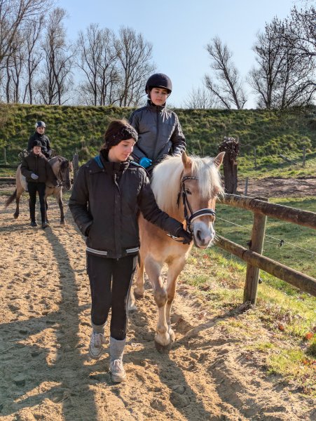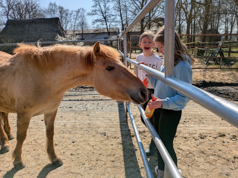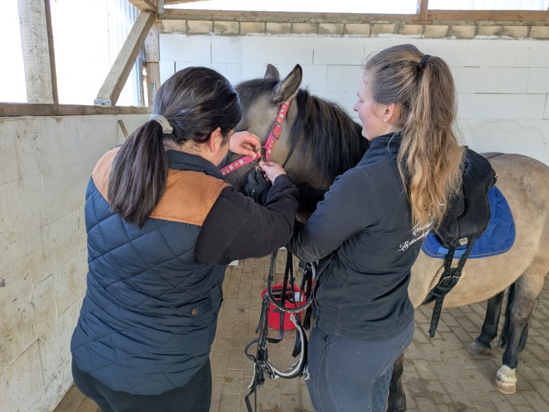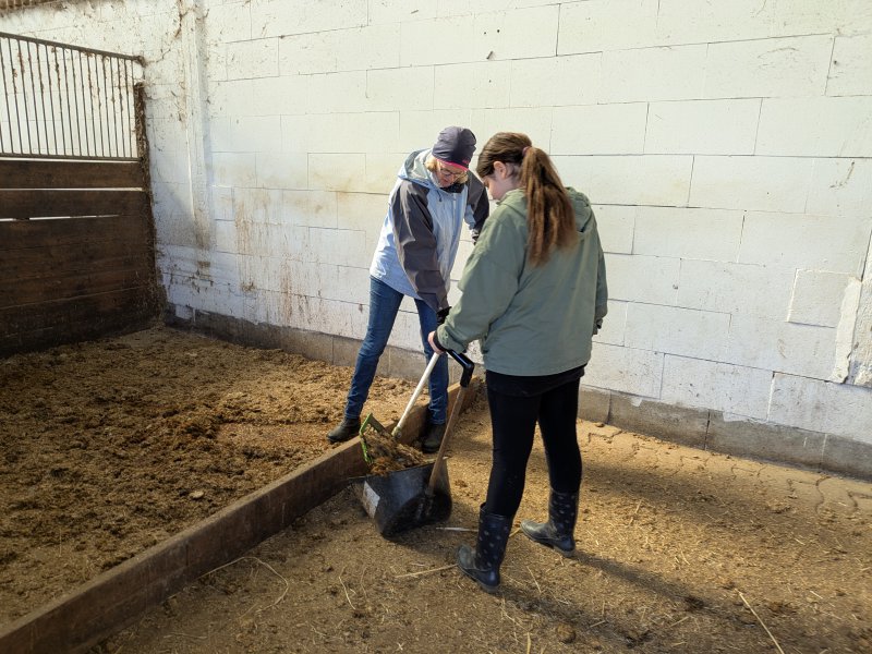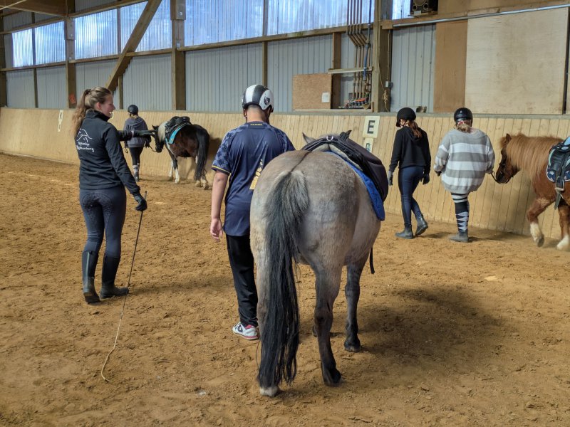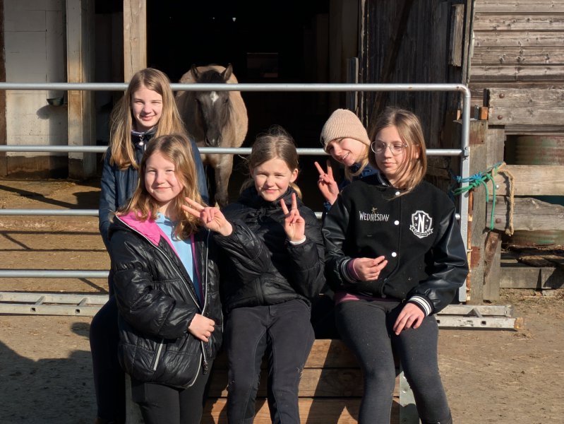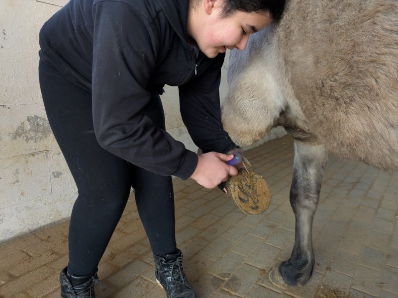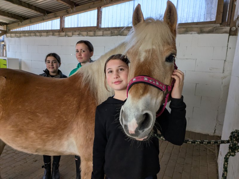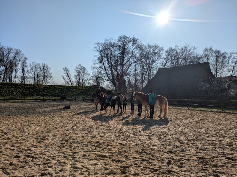 Denn neben dem Reiten ging es auch darum, die Ponys zu pflegen und zu versorgen – mit allem, was ein Pferd so braucht. Misten, füttern, Hufe kratzen? Alles stand auf dem Programm. Außerdem gab es auch ein bisschen theoretisches Wissen mit auf den Weg, das dann direkt in der Praxis genutzt wurde: Wie heißen denn eigentlich die einzelnen Teile der Trense? Wofür ist welche Bürste? Und ist das Knie meines Ponys an der gleichen Stelle wie bei mir? In all diesen Angelegenheiten sind unsere 16 Reit-Einsteiger*innen inzwischen Profis.
